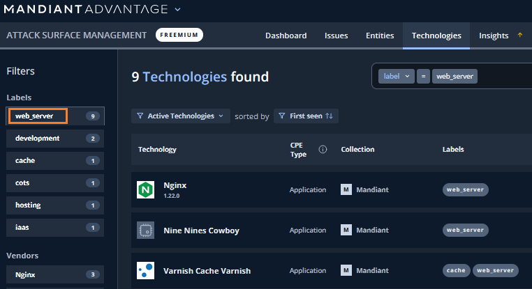 2.左ペインのFiltersを選択することで、表示するTechnologies をフィルタすることができます。web_server を選択して、Webアプリケーションに関連するテクノロジーを確認します。デモ環境では、Apache HTTP Server や Nginx などのソフトウェアとそのバージョンが確認できます。