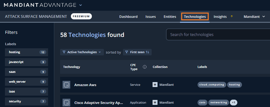 続いて、ASMが発見したTechnologies (=Entitiesで利用されているアプリケーションやサービス)を確認します。
