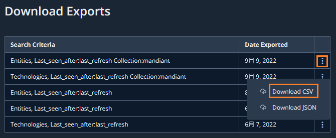 ASMで発見した情報 (Entities, Technologies, Issue) はCSVやJSONファイルとして出力することができます。