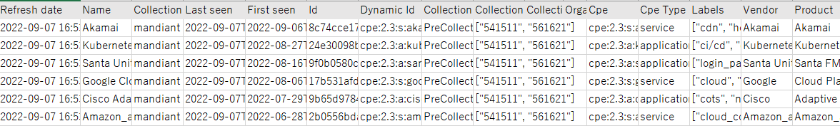 5.エクスポートしたファイルは下記のようになります。組織のIT管理(資産管理など)やセキュリティ対策(脆弱性診断など)へのインプットとして利用可能です。