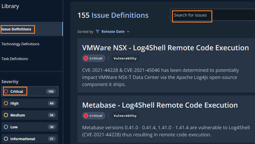 2.左ペインの Issue Definitions をクリックすると、ASMが検査するIssueのリストが確認できます。重大度や検索ウィンドウでフィルタや検索が可能です。適当な脆弱性やキーワードをいれて対応状況を確認してください。