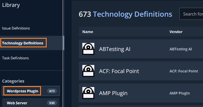 3.左ペインの Technology Definitions をクリックすると、ASMが判定するTechnologyのリストが確認できます。カテゴリやベンダーでのフィルタや検索ウィンドウで利用可能です。自組織で利用中のセキュリティ製品名などがあるか確認してみてください。