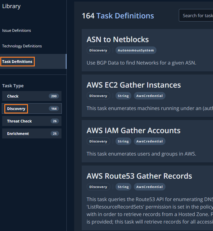 3.左ペインの Task Definitions をクリックすると、Task Type で Discovery を選択すると、Entity探索処理のタスクが確認できます。処理の詳細は非公開のため確認できませんが、どのような内容で探索を行っているかを簡単に確認してください。